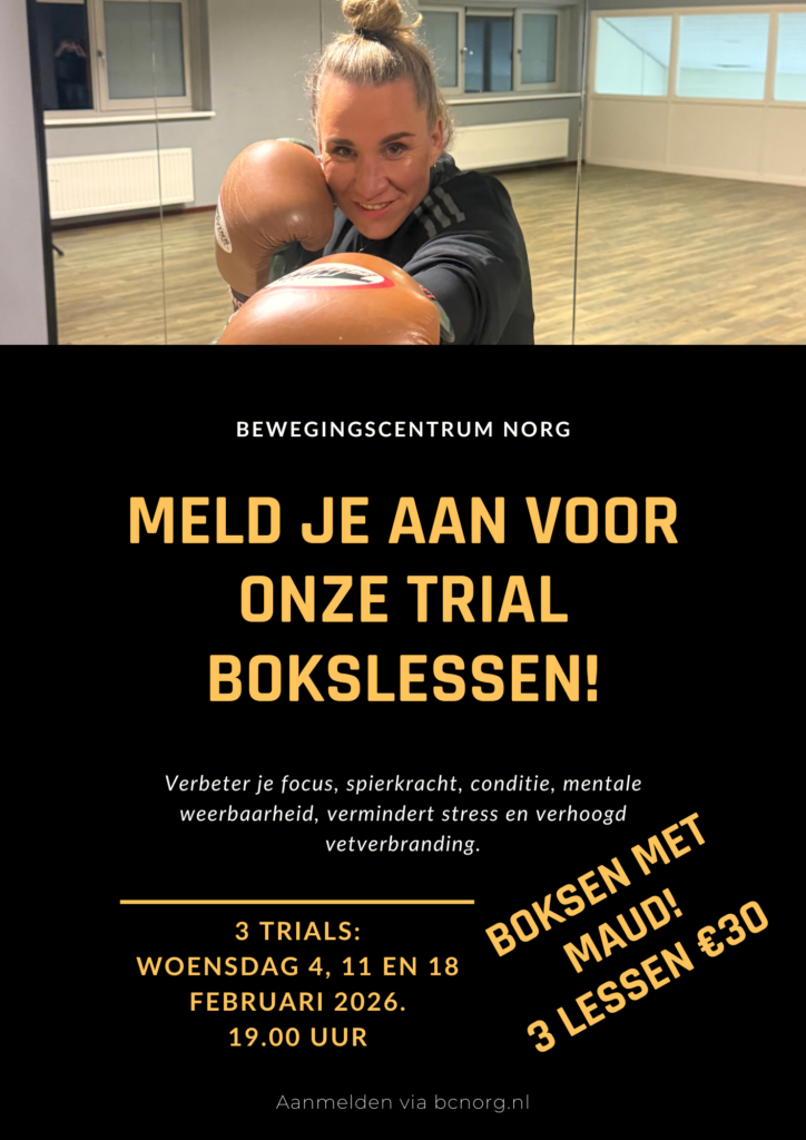 Bewegingscentrum Norg zet bokslessen op het programma als TRIAL. We verzorgen drie bokslessen op woensdagavond om 19 uur. Voor alle materialen wordt natuurlijk gezorgd.