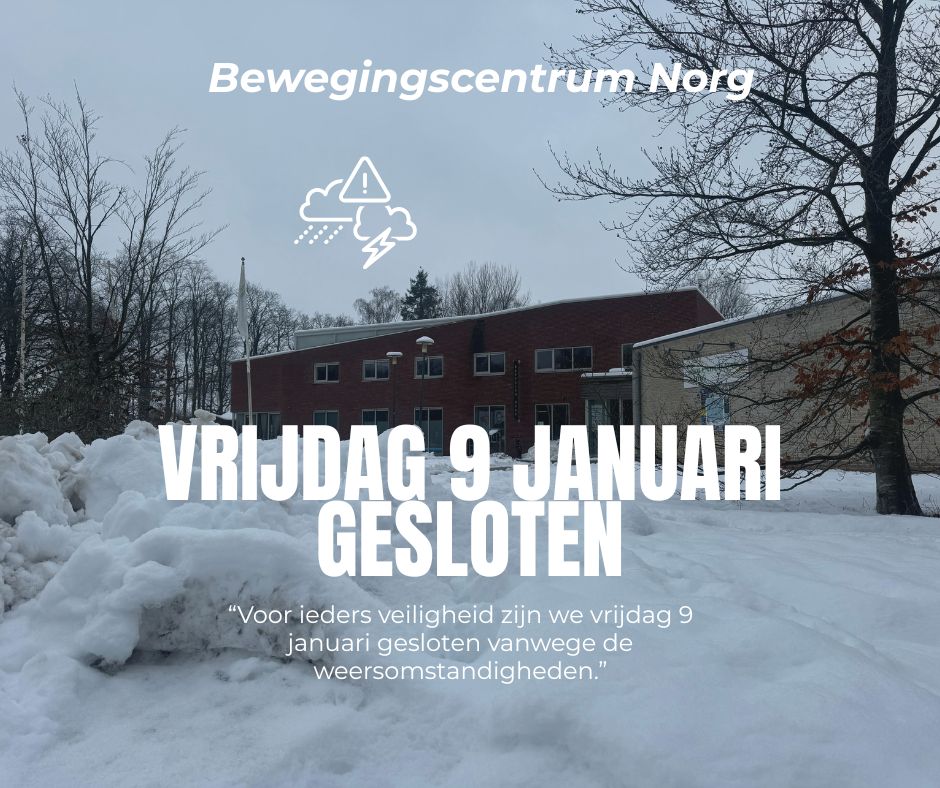 In verband met de huidige weersomstandigheden en de weersvoorspellingen is Bewegingscentrum Norg op vrijdag 9 januari de gehele dag gesloten. Deze maatregel nemen wij om de veiligheid van onze medewerkers, leden en klanten te waarborgen. Wij danken jullie voor het begrip.